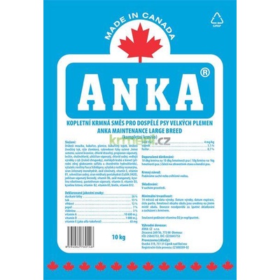 ANKA Maintenance Large Breed 20kg Kompletní krmivo pro dospělé psy velkých plemen Specifikace produktu - granule obsahující všechny potřebné složky - vysoký obsah všech důležitých složek přináší kompletní výživu v menších porcích - čímž se zmenšuje i objem stolice...