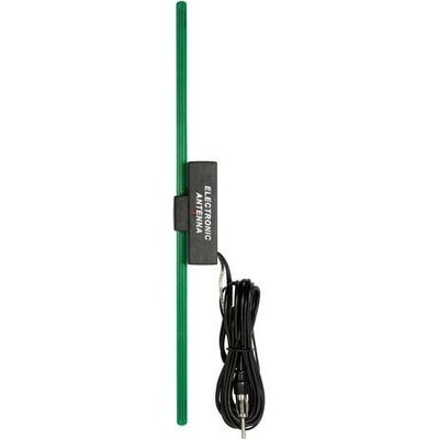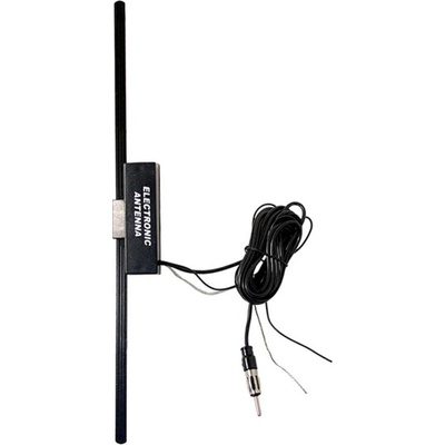 Elektronická anténa určené k montáži na sklo automobilu. Napájení 12 V, délka antény 34 cm, délka kabelu 210 cm, zabudovaný zesilovač.