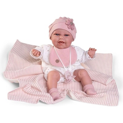 Mluvící, ručně vyrobená realistická španělská panenka. Po zatlačení na bříško začne panenka říkat „mama“, „papa“ a vydávat reálný zvuk smějícího se dítěte. Panenka má měkké...
