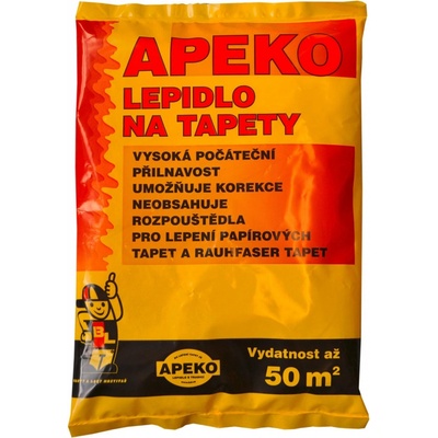 Apeko tekuté lepidlo na tapety 1l Apeko tekuté lepidlo na tapety pro lepení papírových i rauhfaser tapet. Apeko tekuté lepidlo na tapety Pracovní postup: Tapetovaný povrch je nutno zbavit nesoudržných částic, prachu a mastnot. Staré hlinkové nátěry je nutno oškrábat....