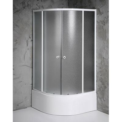čtvrtkruh s dvoudílnými posuvnými dveřmi, 4mm bezpečnostní sklo, provedení rámu bílá, výplň brick sklo, rozměry (š×d×v) 900×900×1 850 mm, poloměr 550 mm
