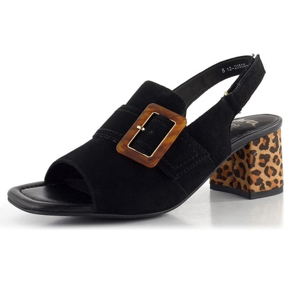 Elegantní a širší dámské sandály v černé barvě s leopardím vzorem na podpatku a patním páskem upínaným na suchý zip.