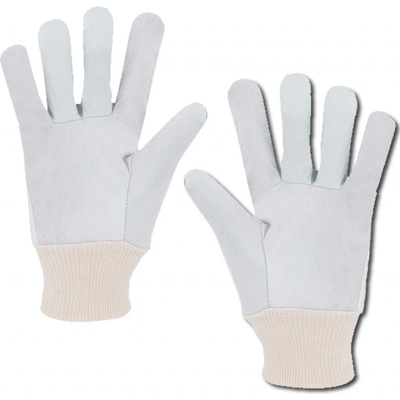 Pracovní rukavice. Dlaň z jemné lícové kozinky, hřbet z bílé bavlněné tkaniny, překryté prsty, náplet na zápěstí. Velikost:10
