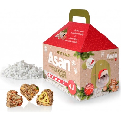 -- Asan Petit je podestýlka pro drobné hlodavce jako např. křečky, křečíky, myšky, pískomily apod. Stelivo je zabaleno v obalu, ze kterého se dá složit přechodný domeček, který můžete využít při výměně podestýlky. Vánoční edice tolik oblíbeného Asan…