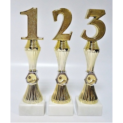 F32-830-LAC014. Velikost trofejí je 21 cm včetně mramorového podstavce. Při nákupu jedné sady trofejí (zlatá, stříbrná, bronzová) - text na štítek napište jen do rubriky "štítek...