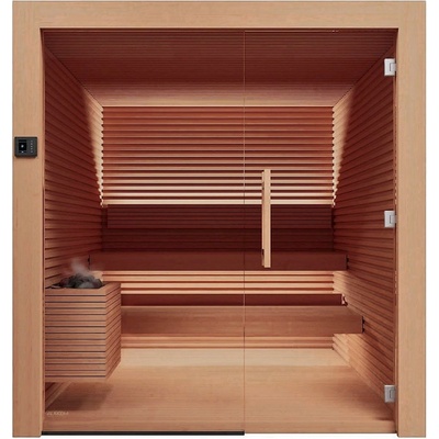 Finská sauna Thermory AS - Finská sauna řady Auroom NATIVA o rozměrech 150x180 cm s celoprosklenou přední stěnou. Sauna je vyrobena z osikového dřeva, které je zpracované pomocí...
