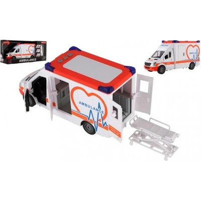 Auto ambulance plast 26cm s lehátkem na setrvačník se světlem se zvukem v krabici 37x18x11,5cm Ambulance je vozidlo, které se využívá při přepravě zraněných pacientů, k...