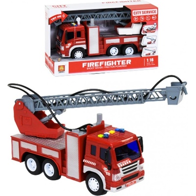 Plastové autíčko pro malé hasiče Technické údaje: Model jezdí na setrvačník, vydává zvuky a bliká. Auto má vysouvací žebřík a můžete stříkat vodu jako opravdový hasič....