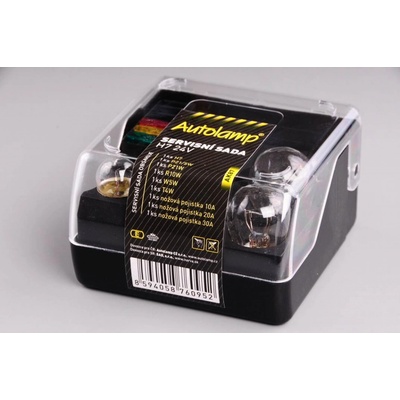 Univerzální servisní krabička s autožárovkou H7, žárovkami P21W, W5W, R10W, T4W a pojistkama Popis: Univerzální servisní krabička s autožárovkou H7 a pojistkami od české firmy Autolamp. Balení obsahuje: 1 ks H7 - 24V 70W PX26d 1 ks P21W - 24V 21W Ba15s 1 ks P21/5W -...