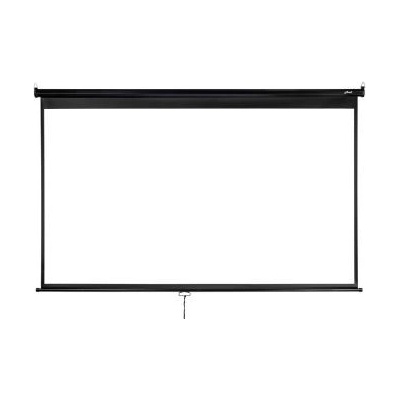 Projekční plátno roletové, rozměr 221 cm × 125 cm, úhlopříčka 100", poměr stran 16:9, matně bílé plátno, černé okraje, černé tělo, k umístění na strop a na zeď, ruční svinování