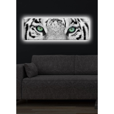 Nástěnný obraz na plátně s led podsvícením zobrazující BÍLÉHO TYGRA. Materiál: PLÁTNO Rozměr: 30 x 90 cm Rám: dřevěný (tloušťka: 3 cm) Zadní strana s led světly Napájení 1...