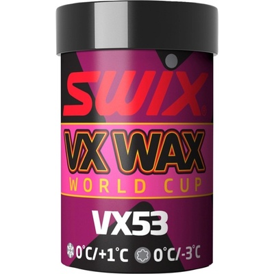 Vosk SWIX VX53 fialový 45 g Čerstvě napadaný sníh 0°C až +1°C Starý jemnozrnný sníh 0°C až -3°C Pevný vosk s vysokým obsahem fluoru. Odrazový vosk s vysokým obsahem fluoru...
