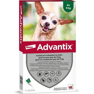 Advantix Spot On 1x 1ml - vysoce spolehlivá ochrana proti klíšťatům, blechám a komárům, bodavým mouchám a všenkám pro psy s váhou 4 až 10 kg. Velmi jednoduchá aplikace pomocí pipety. Advantix poskytuje Vašemu pejskovi navíc ochranu i při namočení, zabíjí larvy blech i...