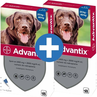 Advantix Spot On 1x4ml pro psy nad 25-40kg (1 pipeta) Tekutý roztok Advantix je určen k ochraně psa před klíšťaty, blechami, komáry, bodavými mouchami a všenkami. Aplikace roztoku je velmi snadná (nakapání na kůži). Vysoce účinné antiparazitikum pro psy Advantix 4 ml...