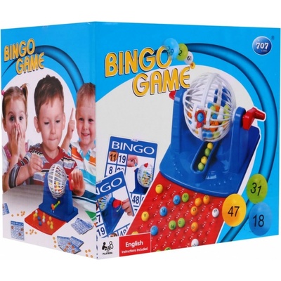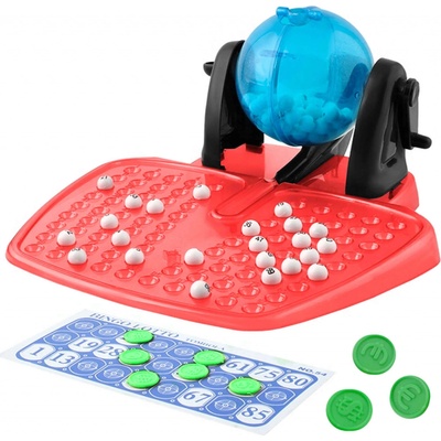 Stolní společenská hra Bingo. Herní set obsahuje plastový mechanický losovací stroj, míčky, žetony a karty. Kompletní bingo losovací stroj s 90 očíslovanými míčky, 120 žetony a...