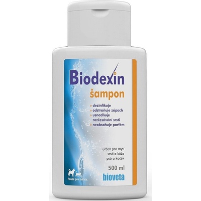 BIOVETA Biodexin šampon 250ml Šampon pro psy a kočky Specifikace produktu - šampon určený pro mytí srsti a kůže u psů a koček v případě potřeby antiseptického, čistícího a desodoračního účinku - přípravek obsahuje roztok antiseptické látky chlorhexidinu v...