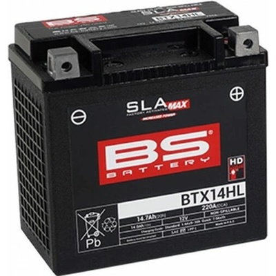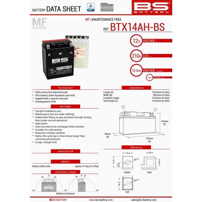 Ve výrobě aktivovaný SLA akumulátor (VRLA, AGM za mokra nabitý), značení dle normy JIS YTX14HL, 12V 14Ah CCA 220 A, Rozměry 149x87x144 mm., Maximální náklon 90°. Nové baterie...