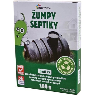 Bacti ZS je prostředek určený pro rozklad organických nečistot, usazenin a kalů v žumpách a septicích. Působením této směsi bakterií a enzymů dochází ke zkapalnění pevného organického odpadu, který se změní v nezapáchající kapalinu. Kapalinu lze posléze odčerpat...