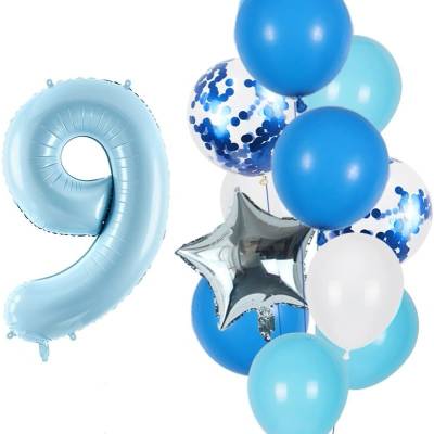 Balónkový set 9.narozeniny, modrý, 11 ks, obsahuje: - 1x fóliový balónek číslo 9 modré, vel. 86 cm, - 1x fóliový balónek hvězda stříbrná, - 2x balónek konfeta modrá, 30...