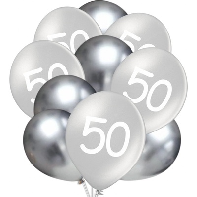 Balónky 50 narozeniny stříbrné 10 ks 30 cm mix V balení je 5 x ks balónků stříbrných metalických s potiskem čísla a 5 x ks balónků stříbrných chromových. Doveďte svou...