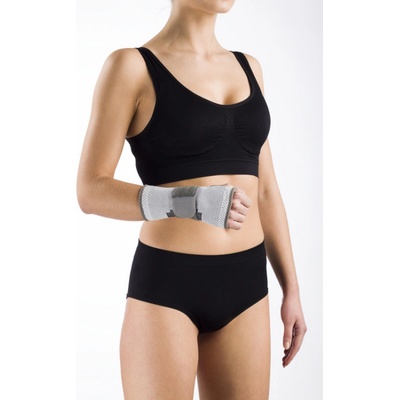 Ortéza zápěstí z vícesměrné 3D pleteniny s tvarovatelnou volární dlahou a gelovým vypodložením.