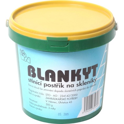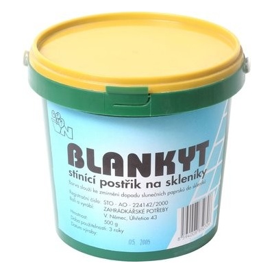 \nPopis a použití:Blankyt je stínící postřik na skleníky, barva slouží ke zmírnění slunečních paprsků do skleníků. Nanáší se nejlépe nastřikem ruční nebo zádovou stříkačkou, případně štětcem. Zaschlý
