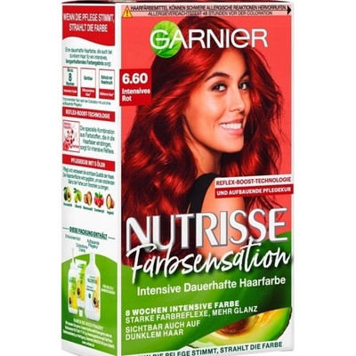 GARNIER Nutrisse BARVA INTENSIVES ROT 6.60 Sada obsahuje: - 1 x aktivační mléko 60 ml - 1 x barvicí krém 40 ml - 1 x kondicionér 60 ml - 1 pár ochranných rukavic 6.60 –...