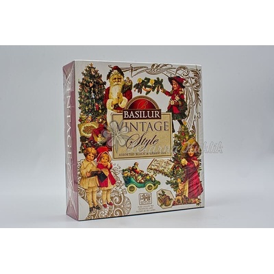 BASILUR VINTAGE ASSORTED PŘEBAL 30X2G A 10X1,5G Vánoční dárková kazeta se 3 druhy černých porcovaných čajů a 1 druhu zeleného čaje Složení: - černý čaj, přírodní aroma (vanilka, jahoda, smetana) - černý čaj, přírodní aroma (zázvor, citron, med, vanilka) - zelený...