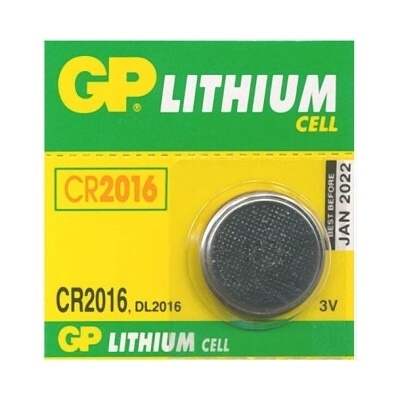 GP CR2016 (CR2016, DL2016), 3V • jmenovitá kapacita: 90 mAh (při zátěži 30 kOhm) • rozměry: průměr 20,0 x 1,6 mm • prodejní obal: 1 ks, blistr