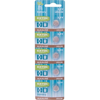 Baterie alkalické, 5ks, 1,5V (LR54, LR1130) EXTOL ENERGY Baterie alkalické, 5ks, 1,5V (LR54, LR1130) Parametry: - 1.5 V (LR54, LR1130) - značka: EXTOL ENERGY - AG10, 390,...