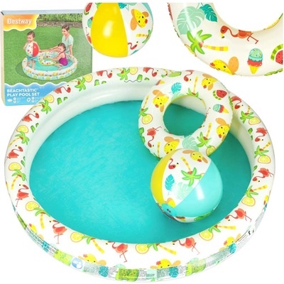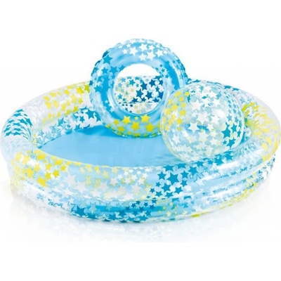 INTEX 59460 Praktická sada kruhového nafukovacího bazénu, plavacího kruhu a nafukovacího míče s veselým letním potiskem. Bazén je vyroben z masivního testovaného vinylu....