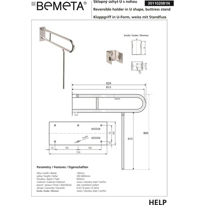 HELP: Madlo, 813 mm, ve tvaru U, sklopné, s opěrnou nohou, bez krytky, nerez, lesk Dokumenty ke stažení Technický list Technický list