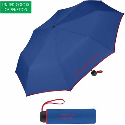Dámský skládací mini deštník United Colors of Benetton Blue Modrá barva s červeným lemem a pogumovanou rukojetí, příjemnou do ruky a s poutkem na zápěstí v barvě lemu. Nápis "...