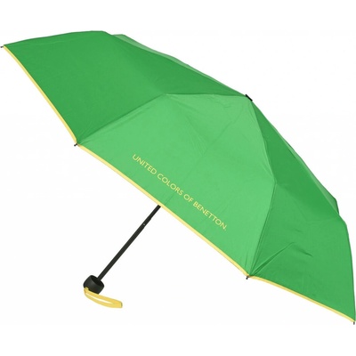 Dámský skládací mini deštník United Colors of Benetton Green Zelená barva se žlutým lemem a pogumovanou rukojetí, příjemnou do ruky a s poutkem na zápěstí v barvě lemu. Nápis "...