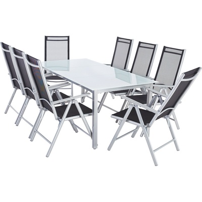 Zahradní hliníková sedací souprava Bern 9dílná | stříbrná Proměňte svou zahradu nebo terasu v elegantní venkovní jídelní kout. S touto vysoce kvalitní zahradní sedací soupravou...