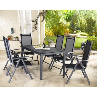 Pohodlně strávené chvíle ve vaší zahradě či na terase Elegantní zahradní sestava s hliníkovým rámem ve stylové antracitové barvě, obsahuje stůl doplněný o WPC stolovou desku a...