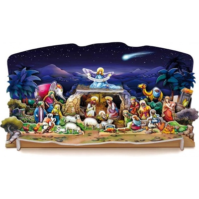 Vysekávaný, jednoduše sestavitelný betlém bez lepidla a nůžek. Vyrobený z 3 mm silné lepenky potažené laminem, rozměr sestaveného betlému 44 x 21 x 18cm.