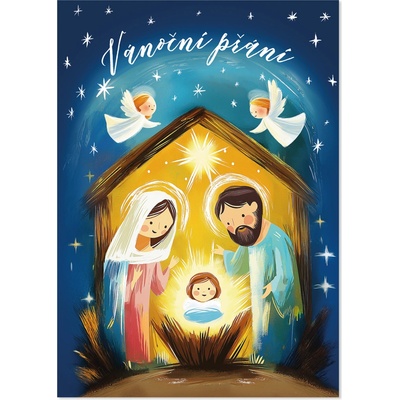 Vánoční hrací přání s malovaným Ježíškem, Marií a Josefem v betlémě. Nad nimi poletují andělíčci a mezi nimi se skví nápis Vánoční přání. Nádherné ilustrace potěší děti i...