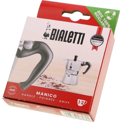 Náhradní díl pro moka konvičky Bialetti. Náhradní rukojeť pro hliníkové moka konvičky Moka Express o velikosti 1 - 2 šálky. Upozornění: Rukojeť nemá vyvrtanou dírku na osičku pro uchycení. Před instalací je nutné v požadovaném místě rukojeť provrtat.