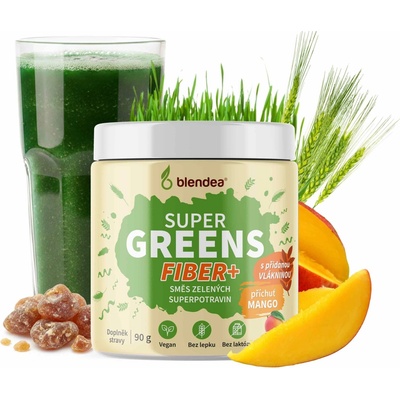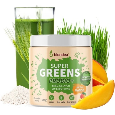 Blendea Super Greens Probio+ obsahuje moderní kombinaci probiotik a 4 zelených superpotravin: chlorelly, spiruliny, zeleného ječmene a mladé pšenice ve formě prášku s mangovou příchutí.