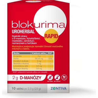 - Blokurima Uroherbal Rapid pro intenzivní péči o Vaše močové cesty1,2. - Sáčky obsahují kombinaci 2 g d-manózy a výtažků z bylin, například rozmarýnu nebo medvědice, které přispívají ke správné funkci močových cest a ledvin1,2. Ženy v každém věku důvěřují Blokurimě...