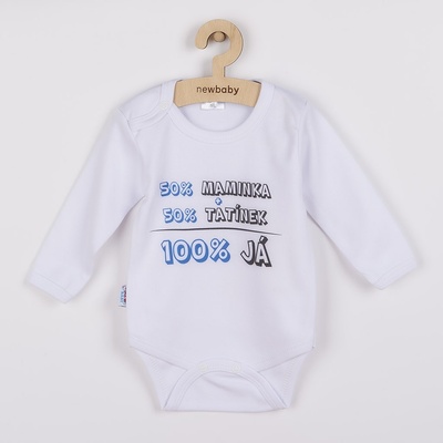 Originální bavlněné kojenecké body s dlouhým rukávem New Baby, s vtipným nápisem 50% MAMINKA + 50% TATÍNEK - 100% JÁ. Body má kolem krčku, nožiček a ručiček barevné lemování....