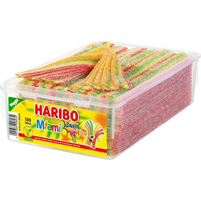 Oblíbené Haribo Miami kyselé pásky. Obsah balení: 150 ks (150x22,5g) Složení: cukr; Glukózový sirup; škrob; Zvlhčovadla: sorbitolový sirup; voda; PŠENICE; Acidifier: kyselina...