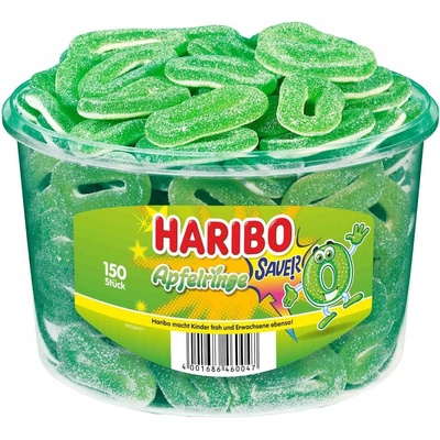 Haribo Sour Apple Rings Ovocné žvýkačky s pěnovým cukrem 150 ks 1200gKyselé kandované kroužky z kyselých jablek jsou již dlouho zasvěceným tipem v sortimentu HARIBO. Ovocná...