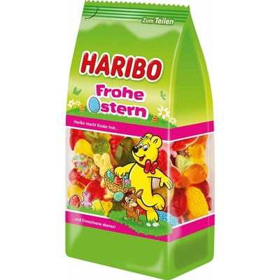 Haribo Frohe ostern 300g - Haribo chutné barevné želé bonbony ve tvarech oveček, vajíček, zajíčků a kuřátek. Zábavné figurky vyrobené z ovocné gumy, některé potažené pěnovým...