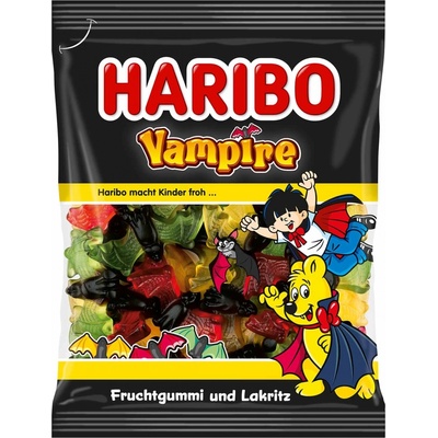 Haribo Vampire barevné ovocné žvýkačky netopýři s lékořicí 175gVytvořte lahodný třepot. Haribo Upíři jsou lahodnou kombinací lékořice a ovocných žvýkaček v barevných variantách....