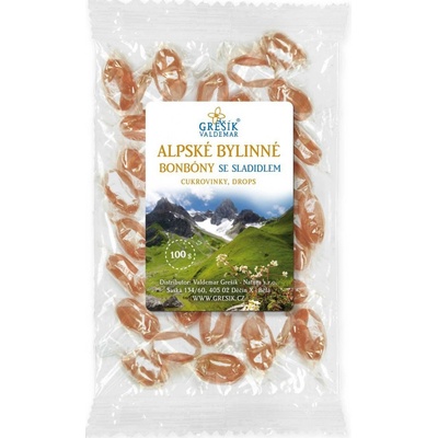 Alpské bylinné bonbóny se sladidlem 100 g - Valdemar Grešík Bonbóny obsahují extrakt ze směsi bylin. Složení: sladidlo: isomalt, přírodní extrakt ze směsi bylin (z toho 0,13 %...