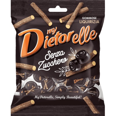 Dietorelle gumové bonbóny s příchutí lékořice - POUZE PŘÍRODNÍ PŘÍCHUTĚ - BEZ UMĚLÝCH BARVIV - BEZ LEPKU - BEZ ŽIVOČIŠNÉ ŽELATINY Složení: sladidla (maltitolový sirup,...