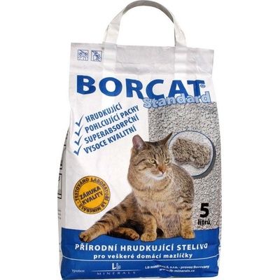 Borcat STANDARD přírodní minerální hrudkující stelivo pro kočky. Při kontaktu s tekutinou vytváří hrudky. Spolu s vlhkostí je uvnitř hrudky uzavřen i pach. Tuhé exkremnty jsou vysušeny obaleny zrny Borcatu, pak již stačí jen odstranit pomocí lopatky pro kočičí toaletu...