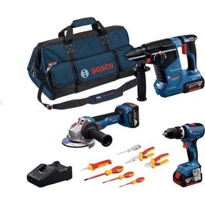 Profesionální sada nářadí se skládá aku příklepové vrtačky GSB 18V-65, aku uhlové brusky GWS 18V-11, aku kladiva GBH 18V-24 C a VDE elektrikářské sady. Dodáváno s 3x 5 Ah...